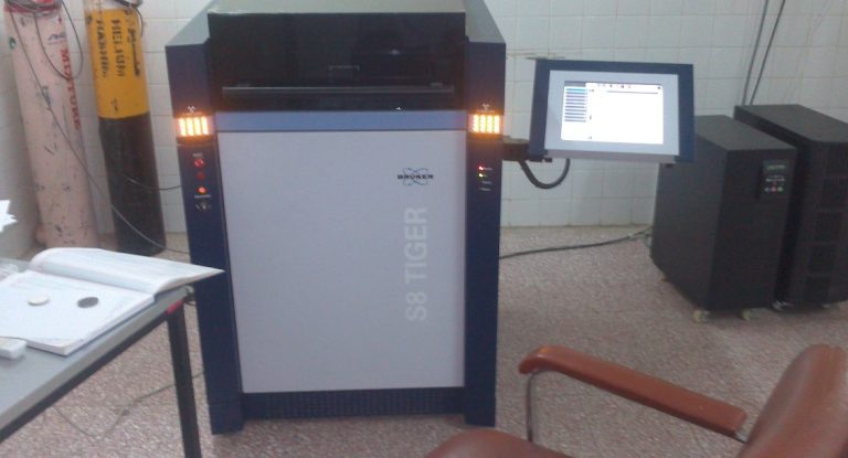 نوع الجهاز بروكر اس 8 تيجر صناعة المانية S-8tiger bruker وهو من أحدث أجهزة التحليل بالأشعة السينية و أكثرها دقة يعتمد على انبوبة التشعيع Rh حد الكشف فيه من 1ppm إلى %100, يقيس جميع عناصر الجدول الدوري إبتداءً من الفلور F و يستخدم الجهاز لقياس العينات الجيولوجية الصلبة والمطحونة والمصهورة إضافة الى قياس العينات السائلة والتعرف على الأحجار الكريمة بقياس تركيبها الكيميائي دون الإضراربشكلها وقياس العناصر الفلزية في العينات العضوية.